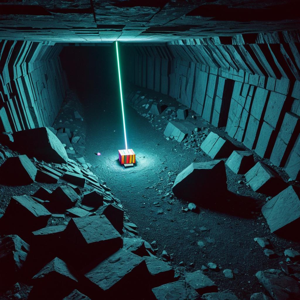 Aerial view of a Brutalist-style underground cave featuring matte basalt walls and scattered blocks. The scene is illuminated by a single neon glowstick light source emitting a vertical cyan beam, creating a surreal synthwave atmosphere.