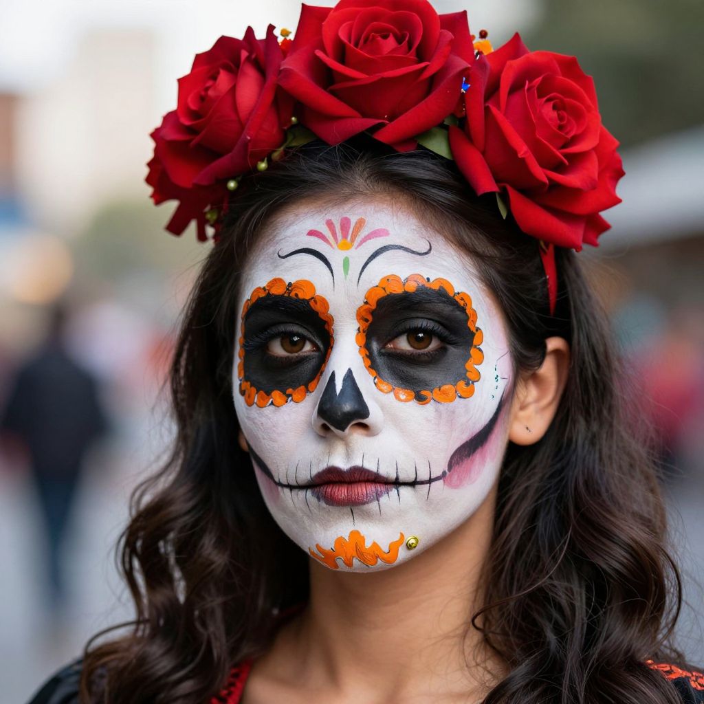 Woman wearing vibrant Day of the Dead sugar skull makeup featuring bold black and orange designs, complemented by a striking red rose crown atop her head, embodying the festive spirit of the holiday.