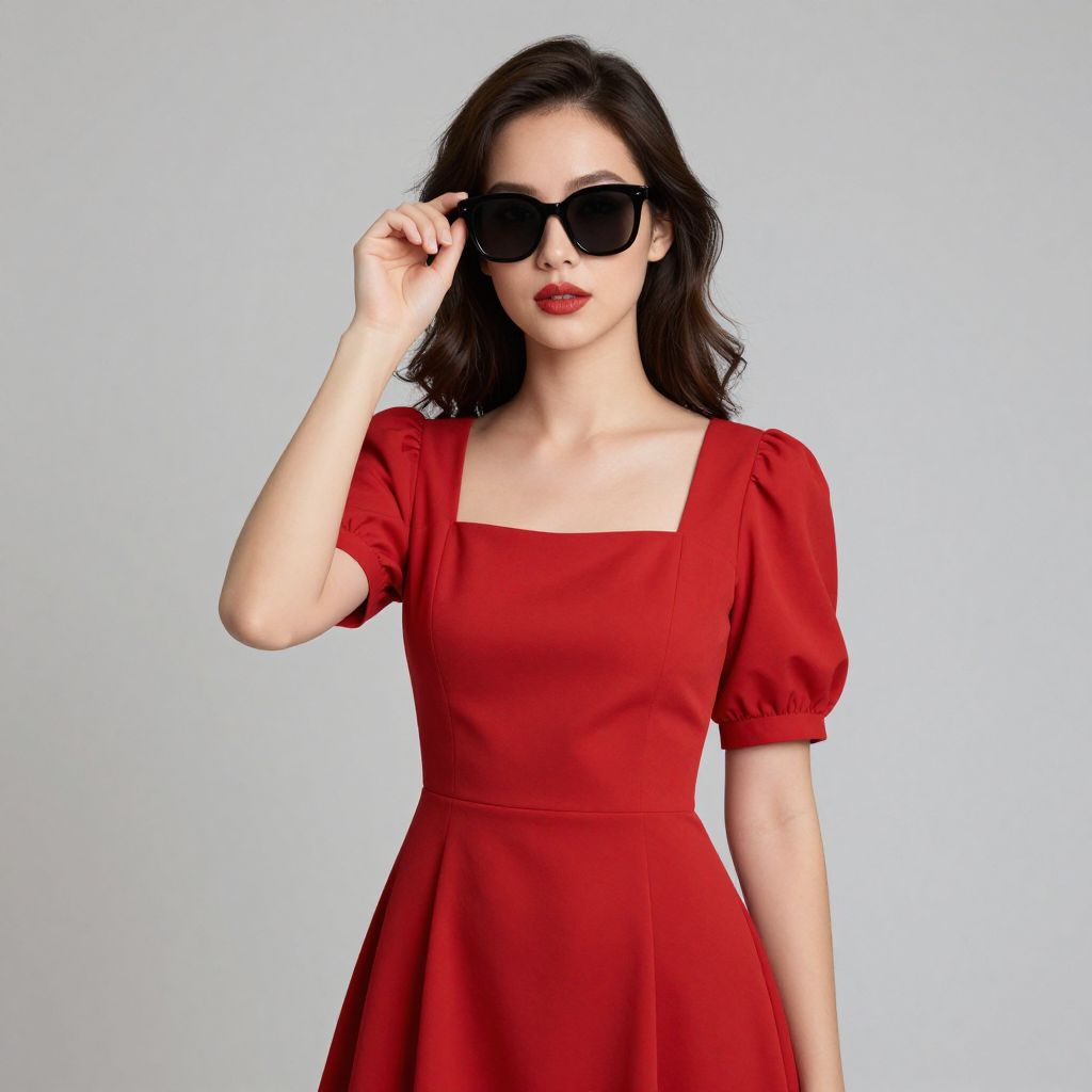 Photograph of a young woman with fair skin and dark brown, wavy hair, wearing a vibrant red, short-sleeved, square-neck dress with a fitted waist. She has red lipstick and is sporting large, black sunglasses. Her right hand is raised to her head, adjusting the sunglasses. The background is a plain, light gray, putting full focus on her stylish, retro-inspired outfit. The image has a polished, fashion editorial feel.