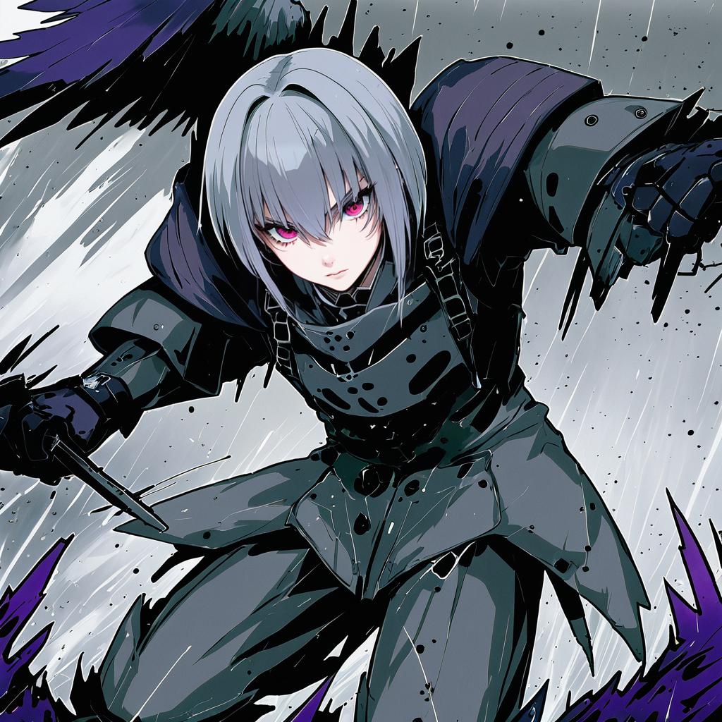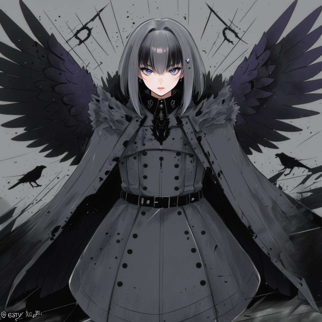 Digital anime-style illustration of a stern young woman with short gray hair and blue eyes, dressed in a detailed gray military-inspired outfit with a black belt and fur collar. She has large black wings extending from her back, set against a gray background with black abstract designs and silhouettes of crows. The artwork is inspired by the character style from the game Punishing: Gray Raven and features a strong, determined expression.
