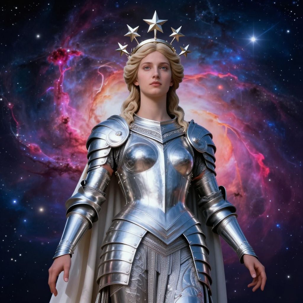 Photorealistic image of a fair-skinned, blonde woman in shining silver medieval armor with a star-crowned headpiece, standing against a cosmic neb