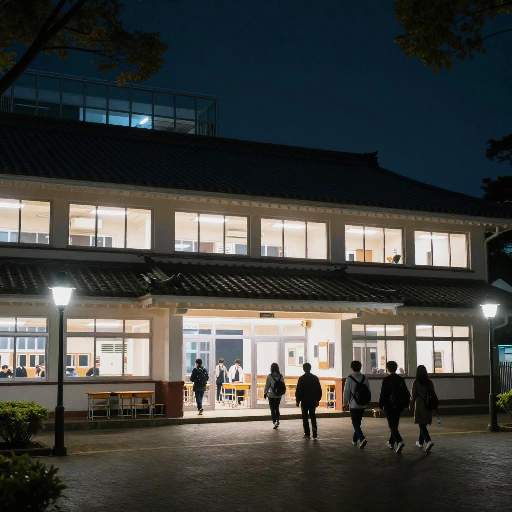 Night scene of a Japanese high school building with illuminated classrooms, quiet and serene atmosphere, traditional tiled roof with modern glass additions, students leaving the building, street lamps casting gentle glows, cinematic and moody lighting.