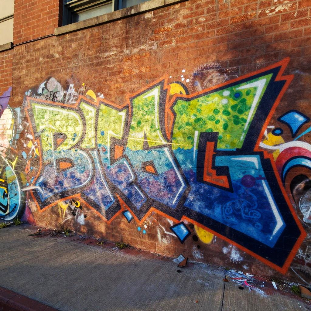 Bumbaclart graffiti art on an urban brick wall, vibrant colors, bold lettering with Caribbean street style, dynamic composition, energetic and rebellious vibe, detailed spray paint texture, sunset lighting casting soft shadows