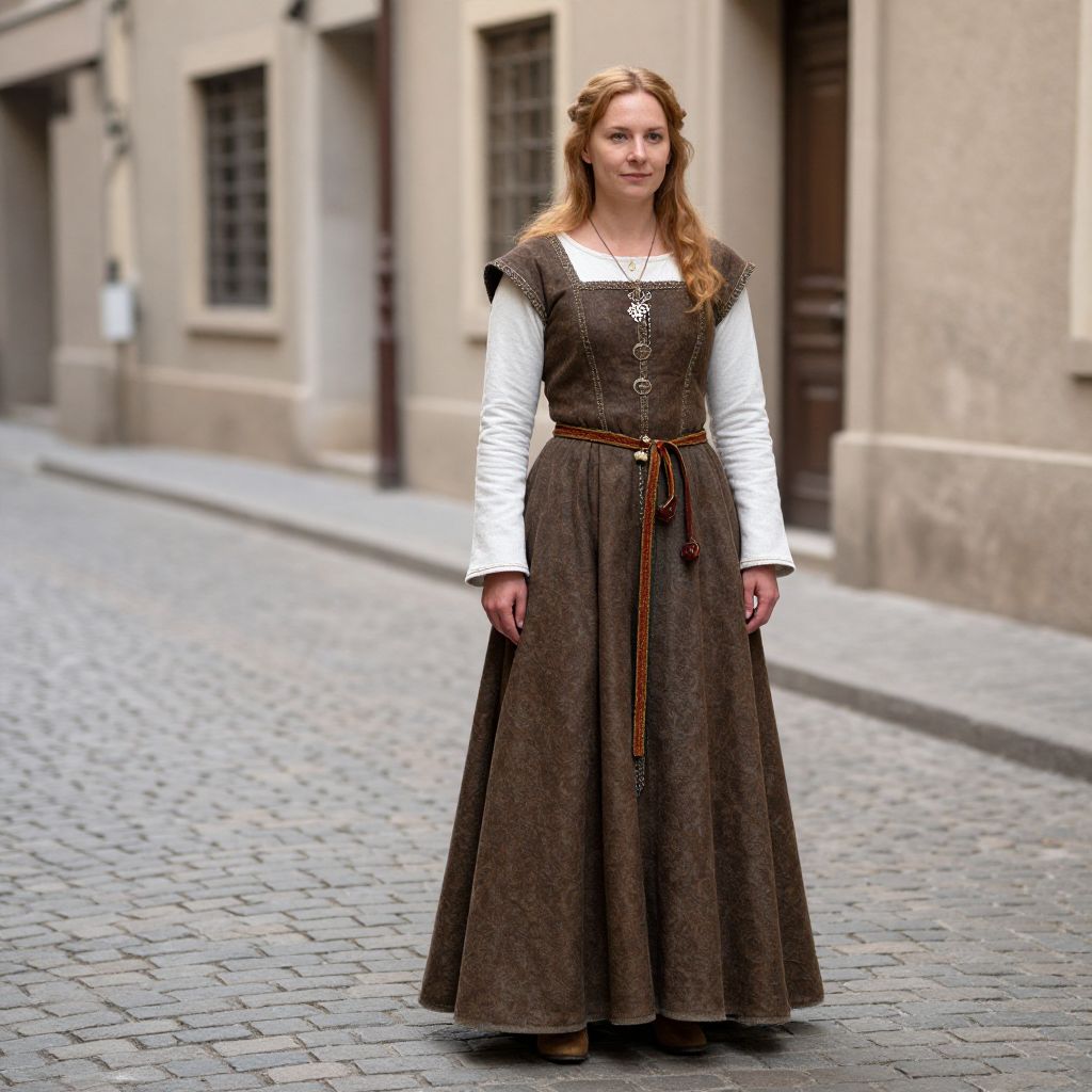Photograph of a young Caucasian woman with light skin and long, wavy, blonde hair standing on a cobblestone street. She wears a medieval-style dress with a dark brown, full-length skirt, white long-sleeve blouse, and brown leather belt. The dress has a fitted bodice with decorative buttons and shoulder slits. She stands with a neutral expression, facing forward. The background features beige, stone buildings with dark wooden windows, typical of a historical European street. The overall scene is brightly lit with natural daylight, highlighting the texture of the cobblestones and her attire.