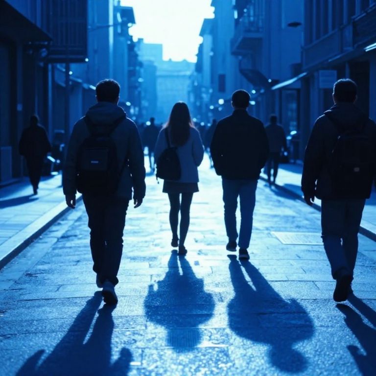 People traverse a surreal urban street bathed in a vivid blue hue, their elongated shadows painted in matching tones, creating an ethereal atmosphere as they walk towards a distant light source.