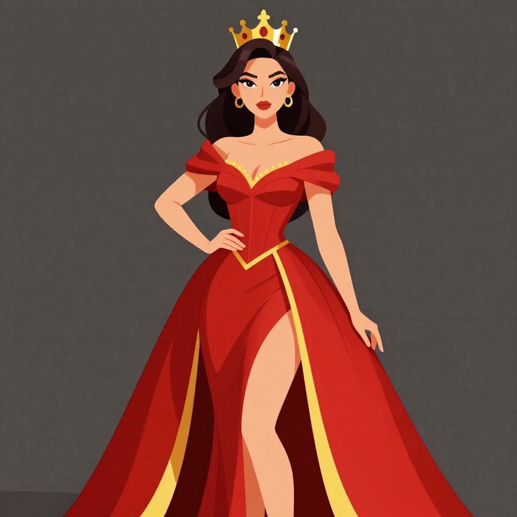 This vibrant illustration features a confident woman adorned in a striking red gown with golden accents, complete with a royal crown. The artwork showcases a blend of modern cartoon style and bold color contrasts, enhancing the sense of elegance and power in her pose.