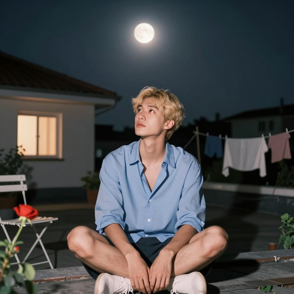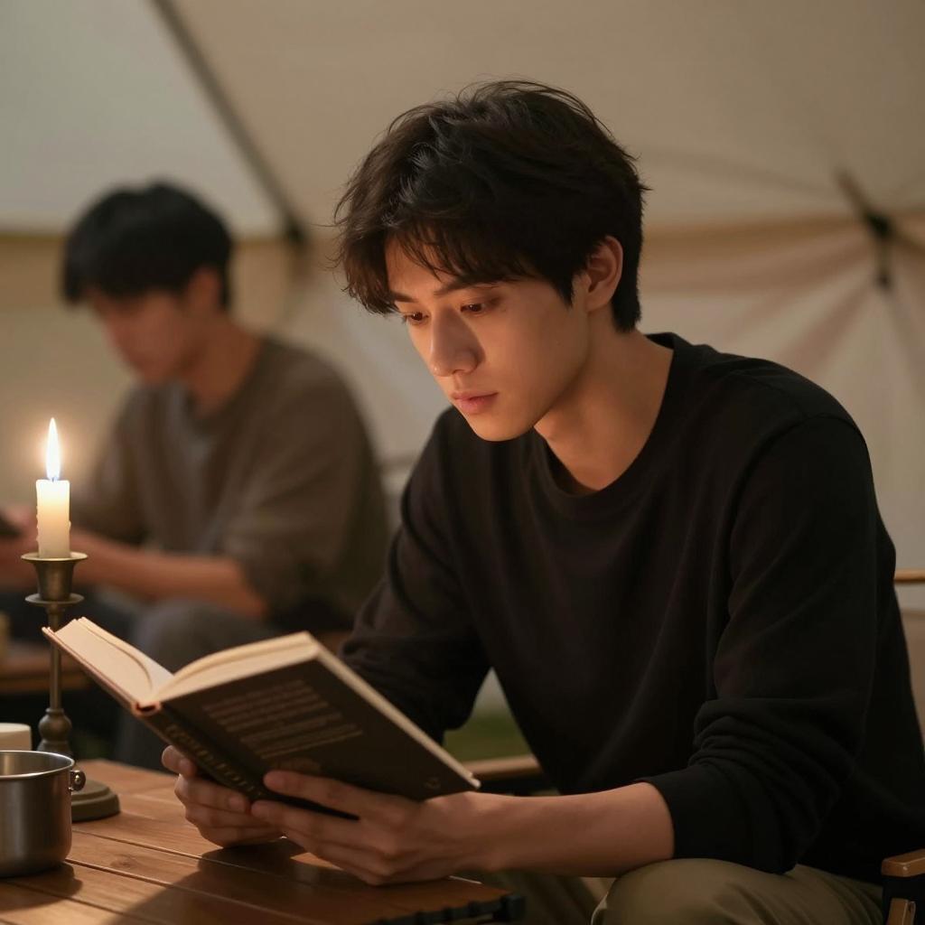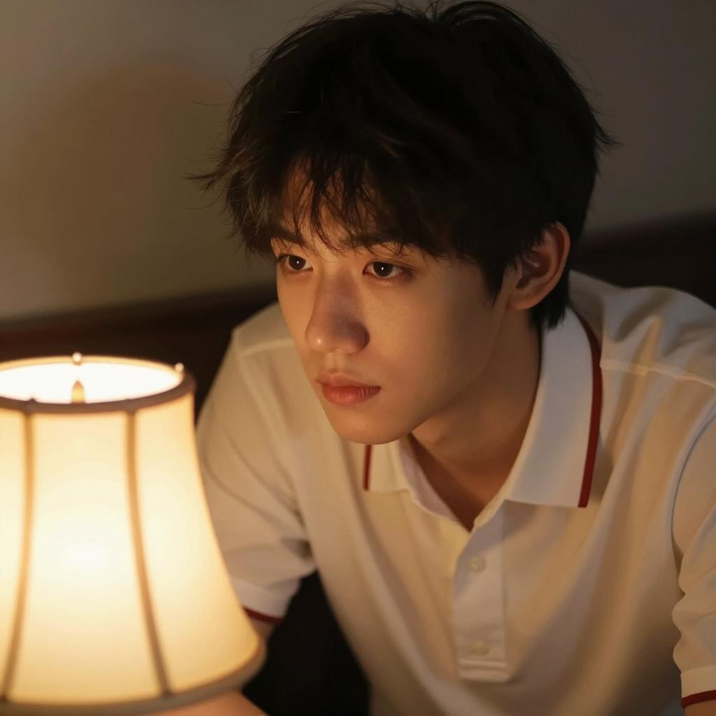 A man with dark hair wearing a brown suit is seated on a chair in a sparsely furnished room. He is looking upward with a contemplative expression. The room features a simple wooden desk with a modern overhead lamp casting light and shadows. A table covered with a white cloth is visible on the right side. The setting is minimalistic and subdued.