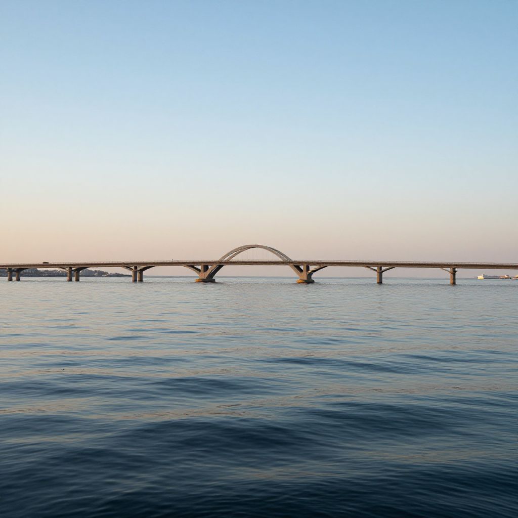 Photograph of a long, arched bridge spanning a calm, blue ocean under a clear, light blue sky at sunrise or sunset. The bridge's structure is dark and metallic, with multiple supporting pillars visible beneath. The water in the foreground has gentle ripples, reflecting the sky's soft colors. The horizon is slightly above the center of the image, with the sun not directly visible. The overall scene is serene and minimalist, emphasizing the bridge's silhouette against the expansive sky and water.