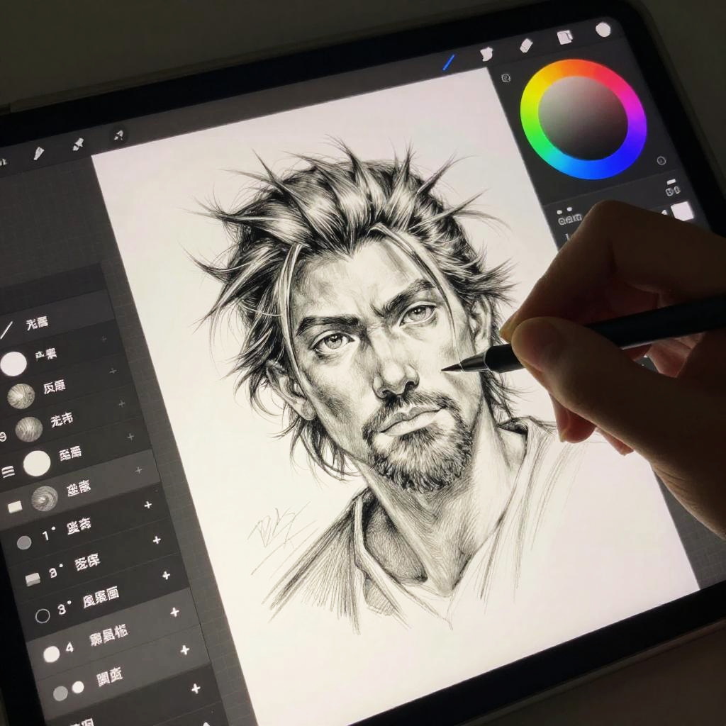 Close-up of tablet screen displaying a sketch picture app session, intricate charcoal style sketch transforming into colored digital painting, interface showing layers, brush settings, and color wheel, high fidelity digital art representation