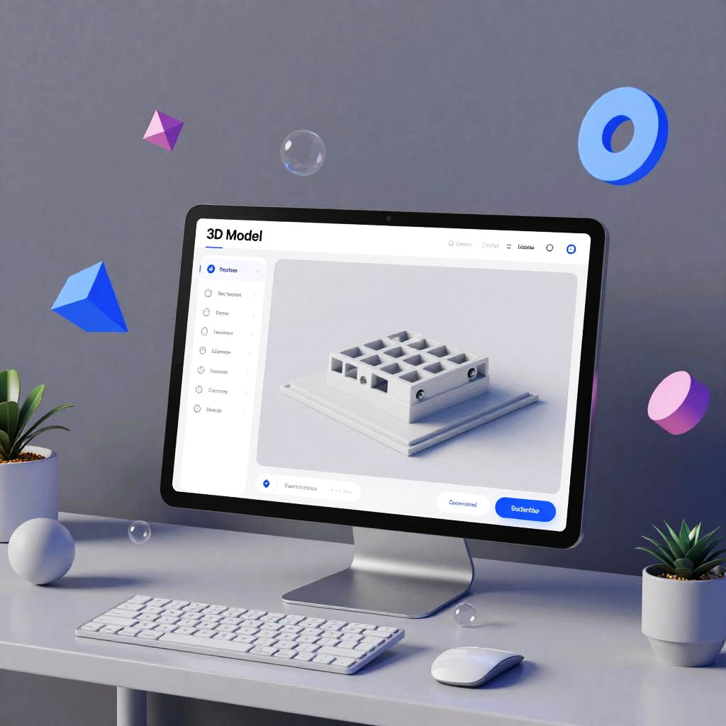 Image to 3D model online creation, user-friendly web platform showcasing an interactive 3D model generated from a flat image, floating digital tools and geometric shapes around, soft ambient lighting, modern UI with neon accents, clean and futuristic workspace