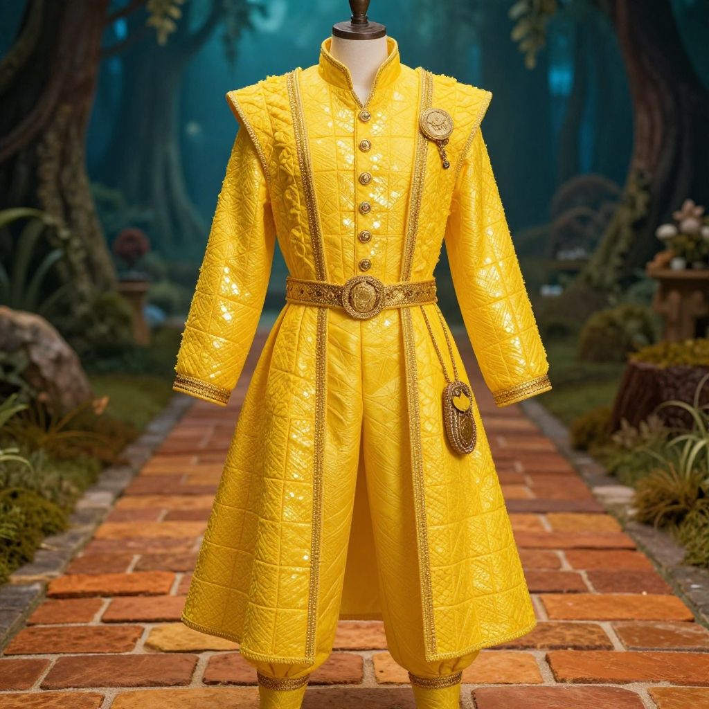 Yellow brick road costume, a vibrant detailed outfit inspired by the magical path from the classic tale, featuring shimmering yellow bricks motifs, textured fabric, intricate golden accents, whimsical accessories, set in a fantasy forest background, cinematic lighting.