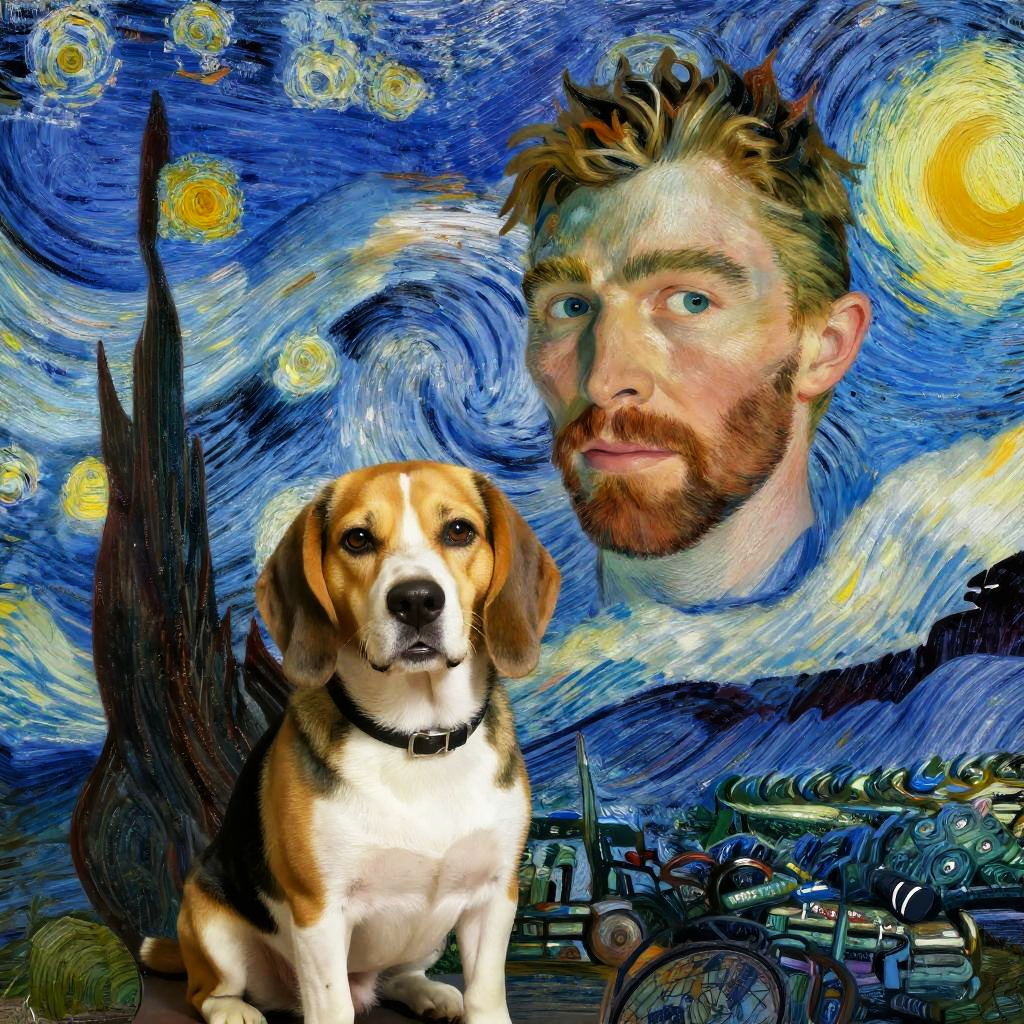 Realistic photo.An illustration of a hybrid creature, combining Chris Hemsworth and a beagle, featuring an oversized head, highly expressive eyebrows, and a mischievous grin. Rendered in the style of Vincent van Gogh with a crayon-like texture, capturing the character's iconic activity or pose. The illustration emphasizes exaggerated features and playful details, blending realism with caricature to create a lively, memorable portrait. realistic photo