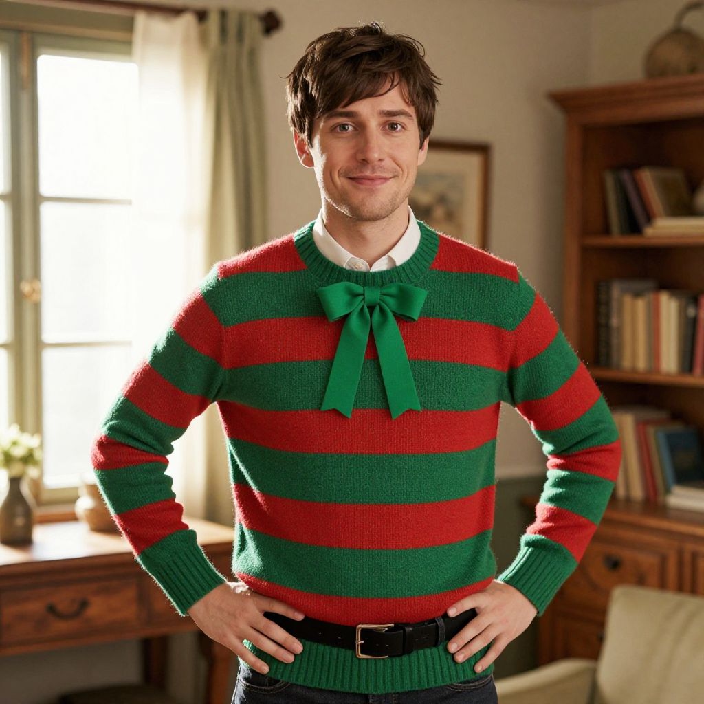 A man with short brown hair stands confidently in a cozy, sunlit room, wearing a warm green and red striped sweater with a black belt securing it at the waist and a vibrant green bow on the front. He has a friendly, approachable expression, with a slight smile and gentle eyes, exuding warmth and charm. The scene is softly lit with natural daylight streaming through a window, highlighting the textures of the sweater and the subtle details of his outfit. Background features rustic wooden furniture and a few bookshelves, adding to the inviting, homey atmosphere.