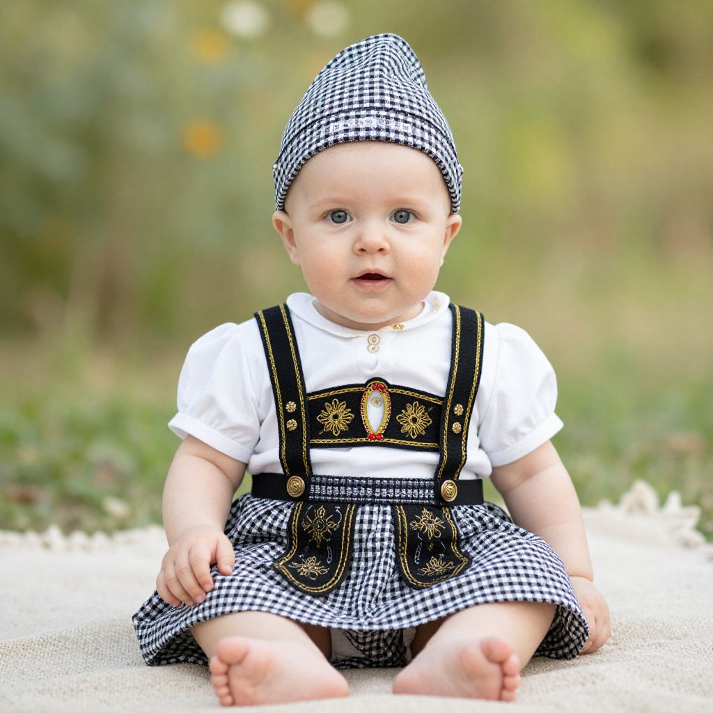 Infant german costume, baby that is dressed in a dress and hat