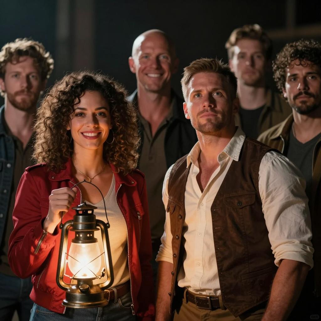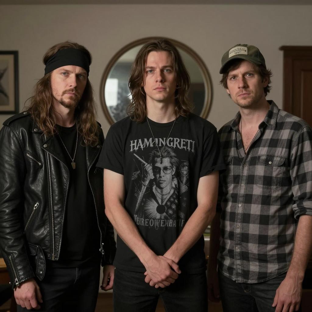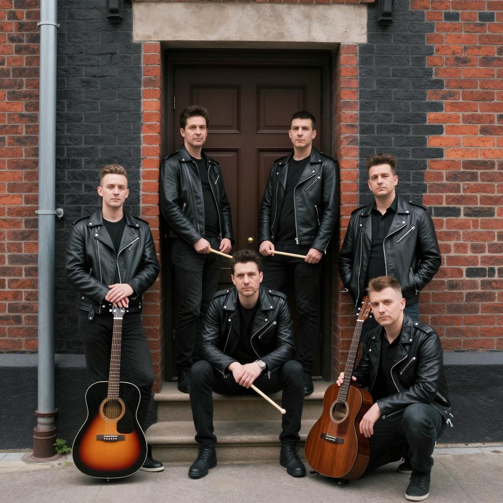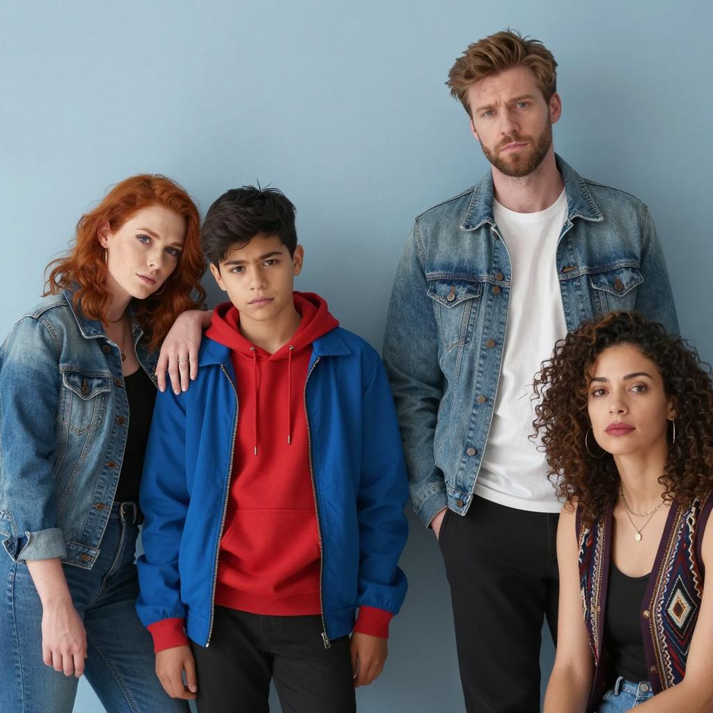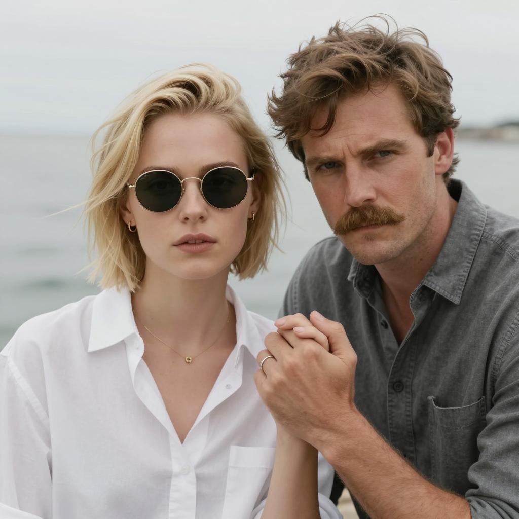 Black and white photograph of five people, each with dark sunglasses, against colorful backgrounds. From left to right: dark-haired man with short hair, medium-bearded man with mustache, blonde woman with wavy hair, bald man with beard, bald man with mustache. Bright backgrounds: orange, turquoise, pink, green. All subjects have serious expressions.