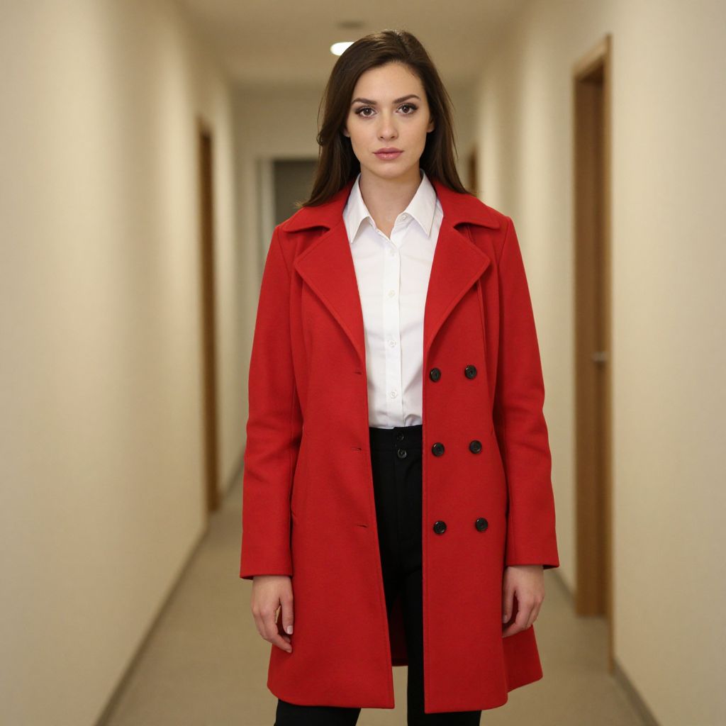 Photograph of a young woman standing in a long, narrow, brightly lit hallway with white walls and wooden doors. She has straight, dark brown hair and is wearing a vibrant red, double-breasted coat with black buttons over a crisp white button-up shirt. She pairs the outfit with black high-waisted trousers. Her expression is neutral, and she stands centered in the frame, looking directly at the camera. The hallway's perspective creates a slight depth of field, blurring the doors and walls in the background. The lighting is even, highlighting her clothing and face.