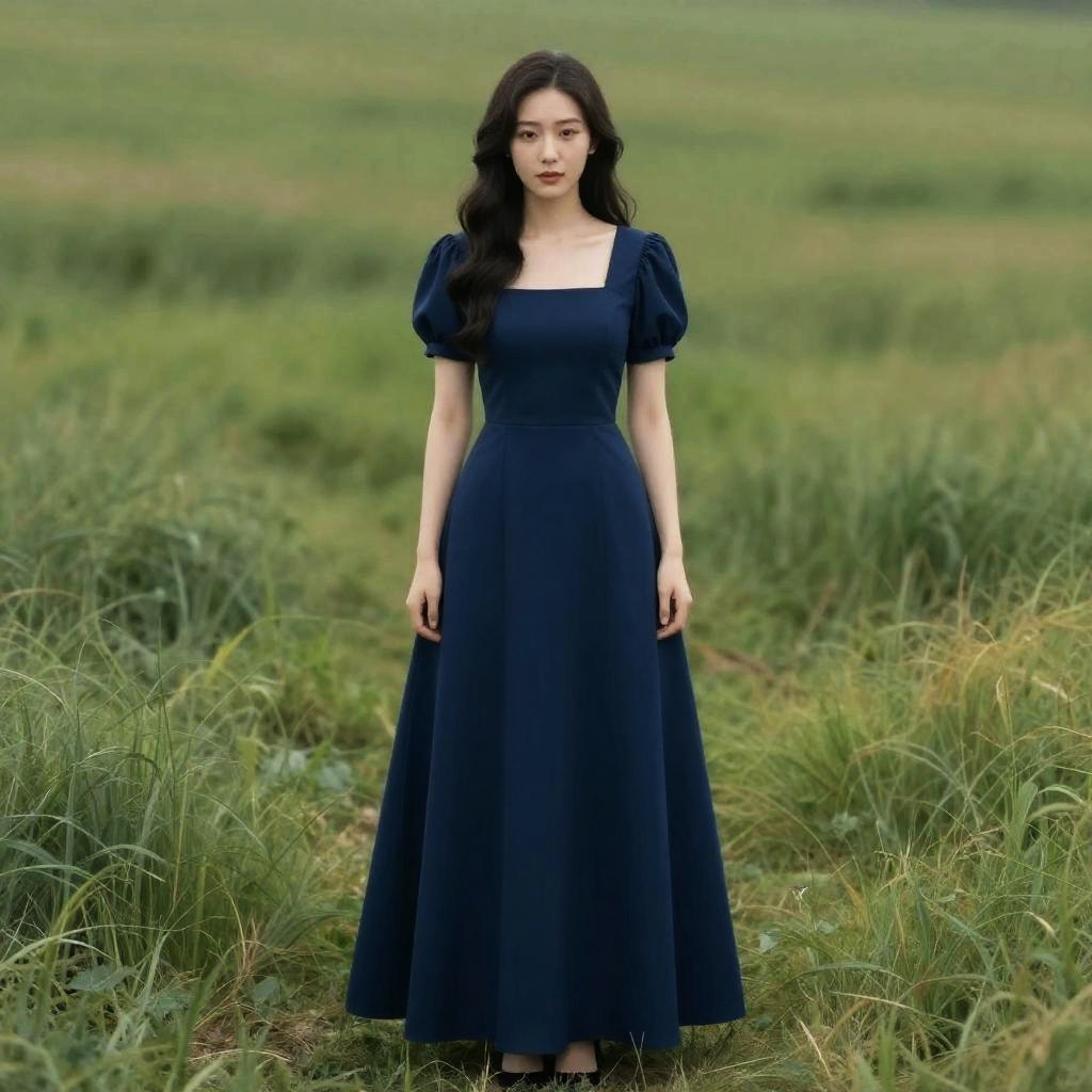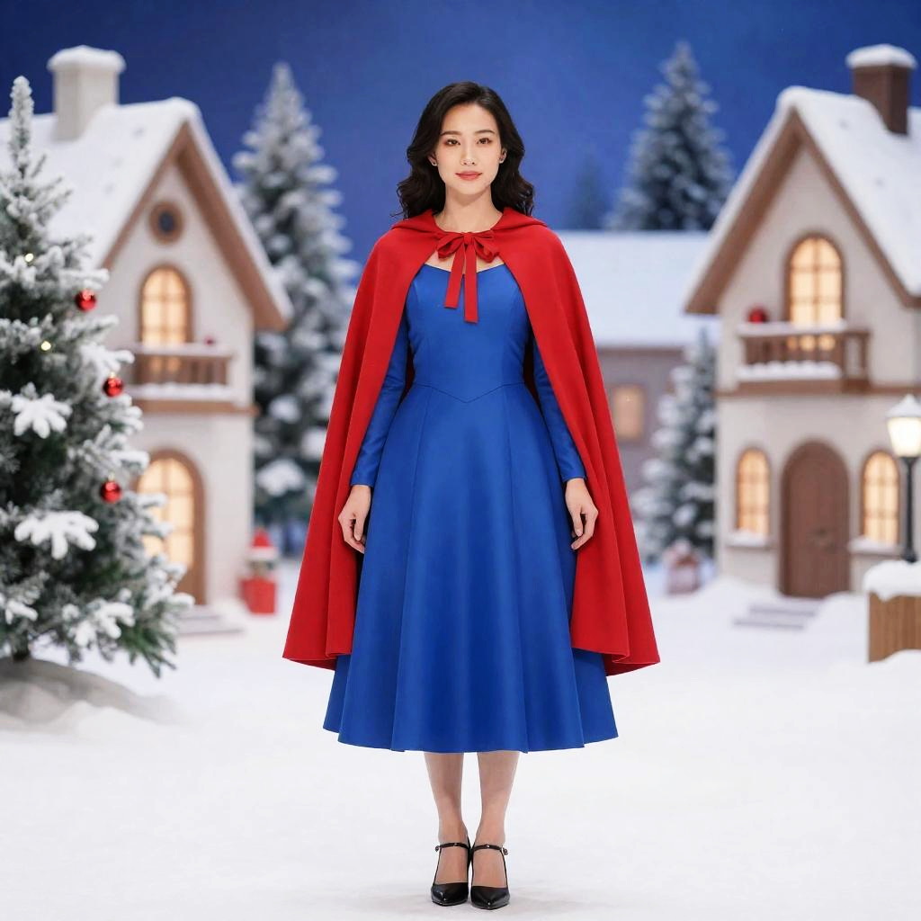 Christmas Party Winter Wonderland Outfit, a woman in a blue dress and red cape standing in front of a christmas village