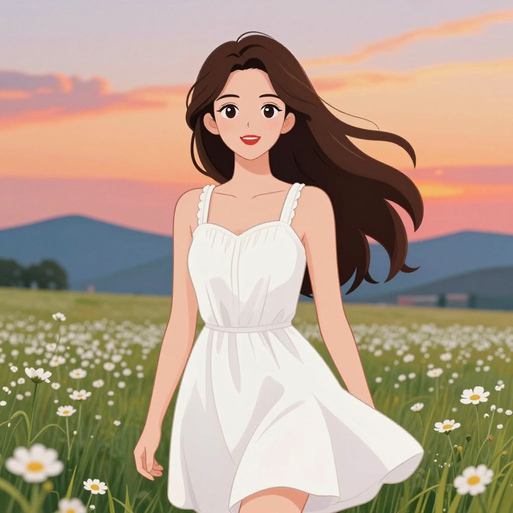 Digital anime-style drawing of a smiling woman with long brown hair, wearing a white sundress, walking through a field of white daisies at sunset