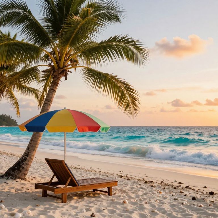 Photograph of a tropical beach with clear blue ocean, white sand, tall palm trees, bright sun, and colorful flowers in the foreground.