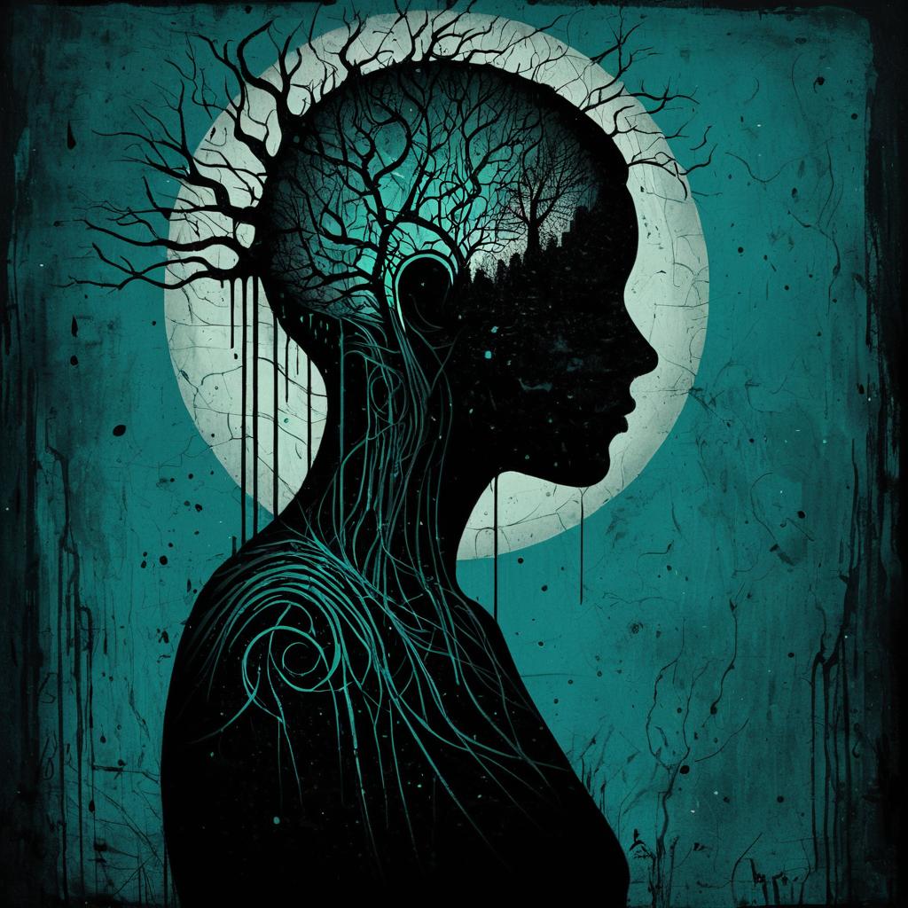 Surreal abstract portrait of a silhouetted figure with intertwined organic patterns and tree branches emerging from the head. The image is rendered in a dark, moody palette with shades of teal and black, incorporating textured and fragmented details that evoke a haunting, enigmatic atmosphere. Inspired by cubism and surrealism, this artwork captures emotional depth and a sense of wistfulness.