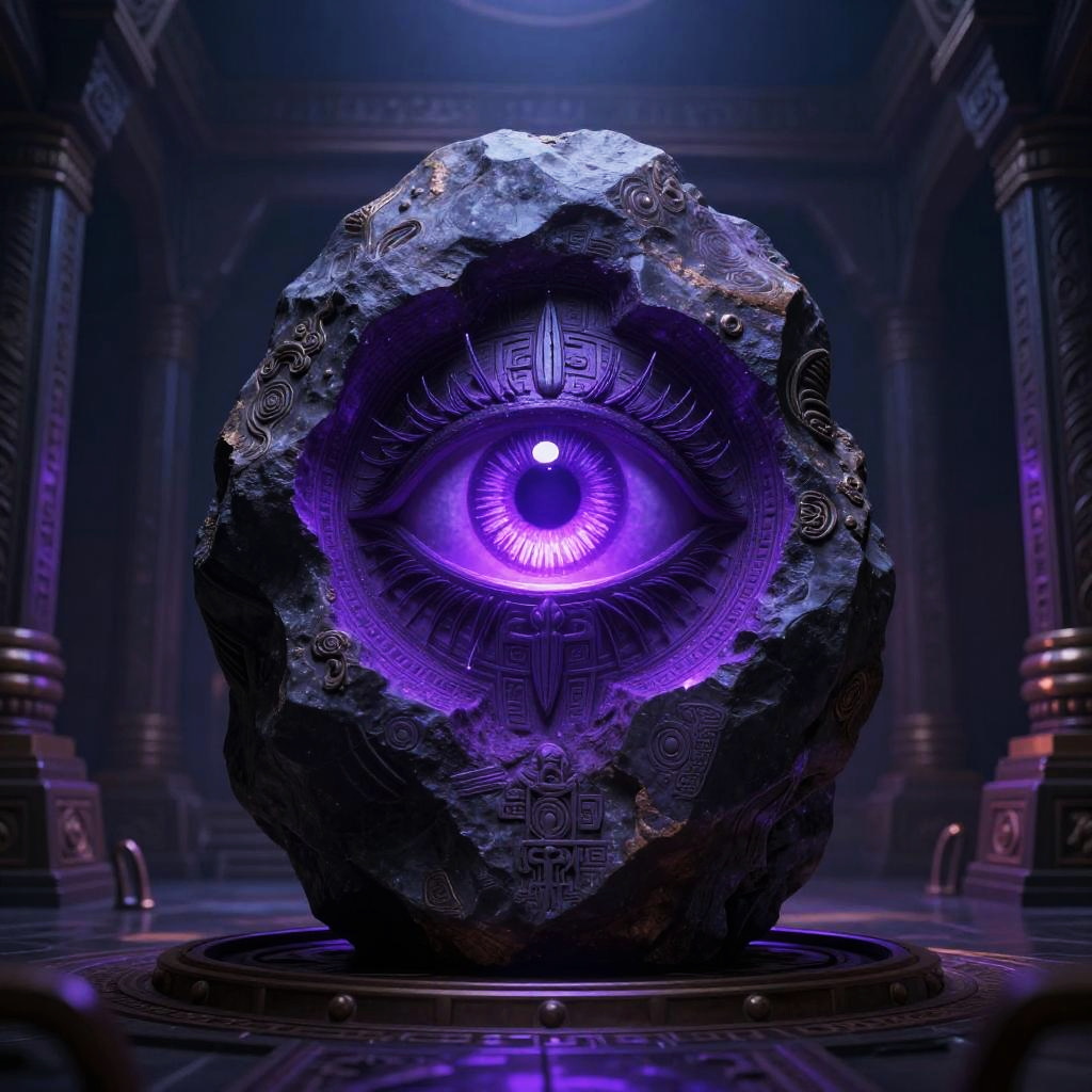 Slaanesh symbols as a complex pattern of intertwined serpents and eyes, glowing with iridescent purple and silver light, set against a background of a ruined temple under a stormy sky, blending themes of decadence, temptation, and chaos.