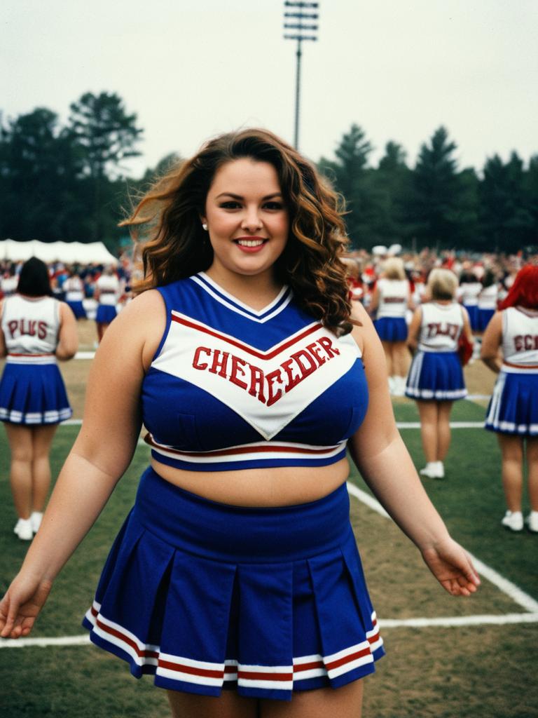 Woman in Plus Size Cheerleader costume, cinematic realism, festival portrait