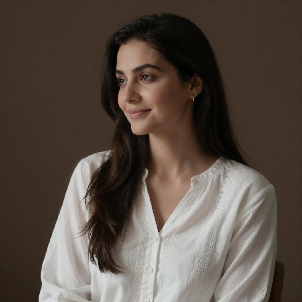Photograph of a woman with dark hair, sitting on a beige couch, wearing a sheer lavender dress with blue feather trim, light green shorts, and earrings. Wooden window in background, patterned wallpaper on the right, sunlight filtering in. She has a slight smile, looking to the side. One arm rests on the couch, the other on her knee. Natural light illuminates her face.