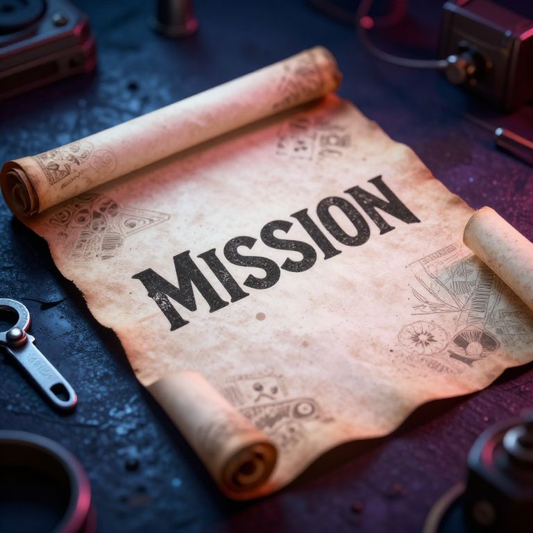 Photograph of a rolled parchment with "MISSION" in bold, black letters, resting on a dark, textured surface with metal locks.