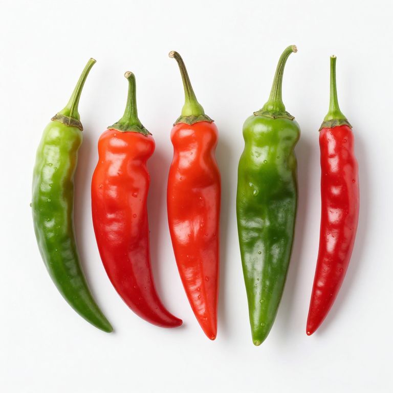 Photograph of five chili peppers in a row, alternating red and green, with shiny, smooth textures and white background.