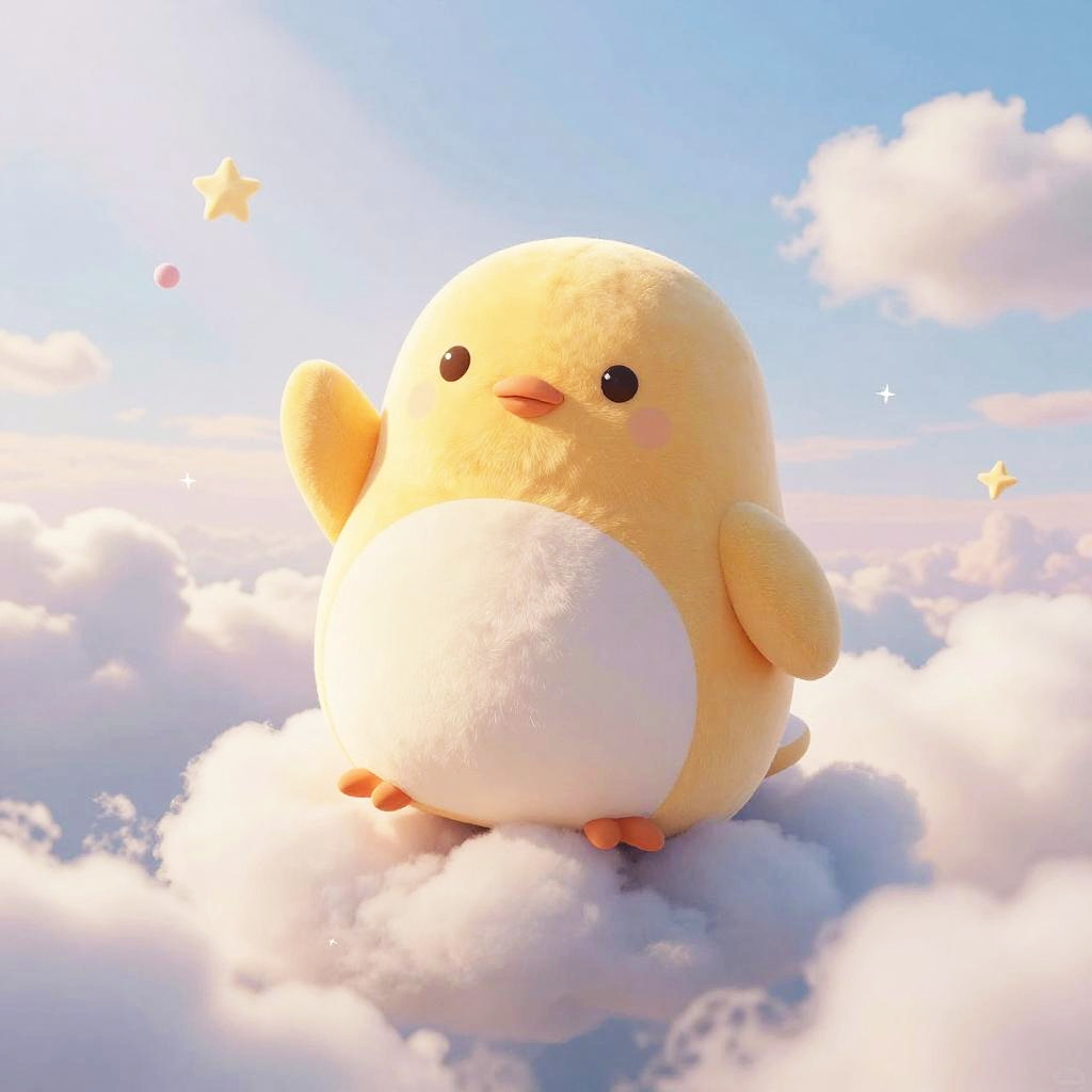 Jyri Squishmallow plushie floating among fluffy clouds in a pastel sky, gentle sunlight beams and tiny stars, soft dreamy surrealism with warm colors
