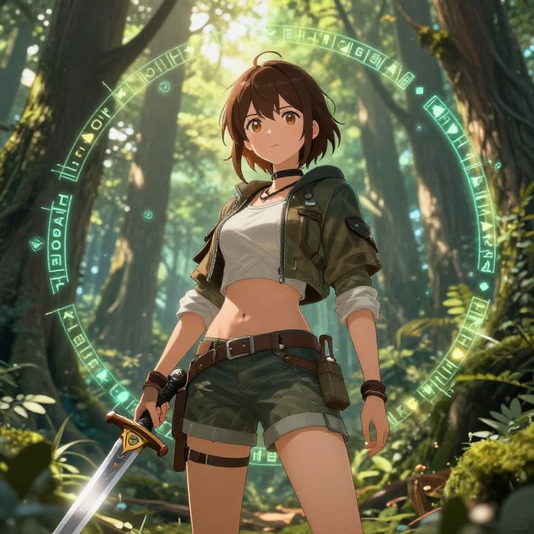 Girl with brown hair anime, adventurous look holding a sword in a fantasy forest, detailed armor mixed with casual clothing, sunlight filtering through tall trees, mystical elements like glowing runes around, high detail, vivid colors