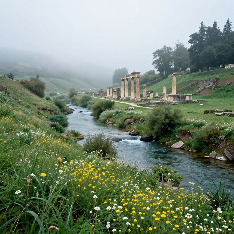 Olympia landscape showing a lush valley with the ruins of ancient Olympia, wildflowers in bloom, a crystal-clear river flowing nearby, morning mist creating a mystical and peaceful vibe, photorealistic style