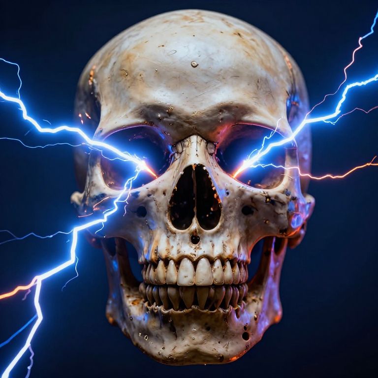 Digital artwork of a realistic human skull with glowing blue eyes emitting electric lightning bolts, set against a dark background. The image features glitch effects around the eyes, creating a dynamic and intense visual impact.