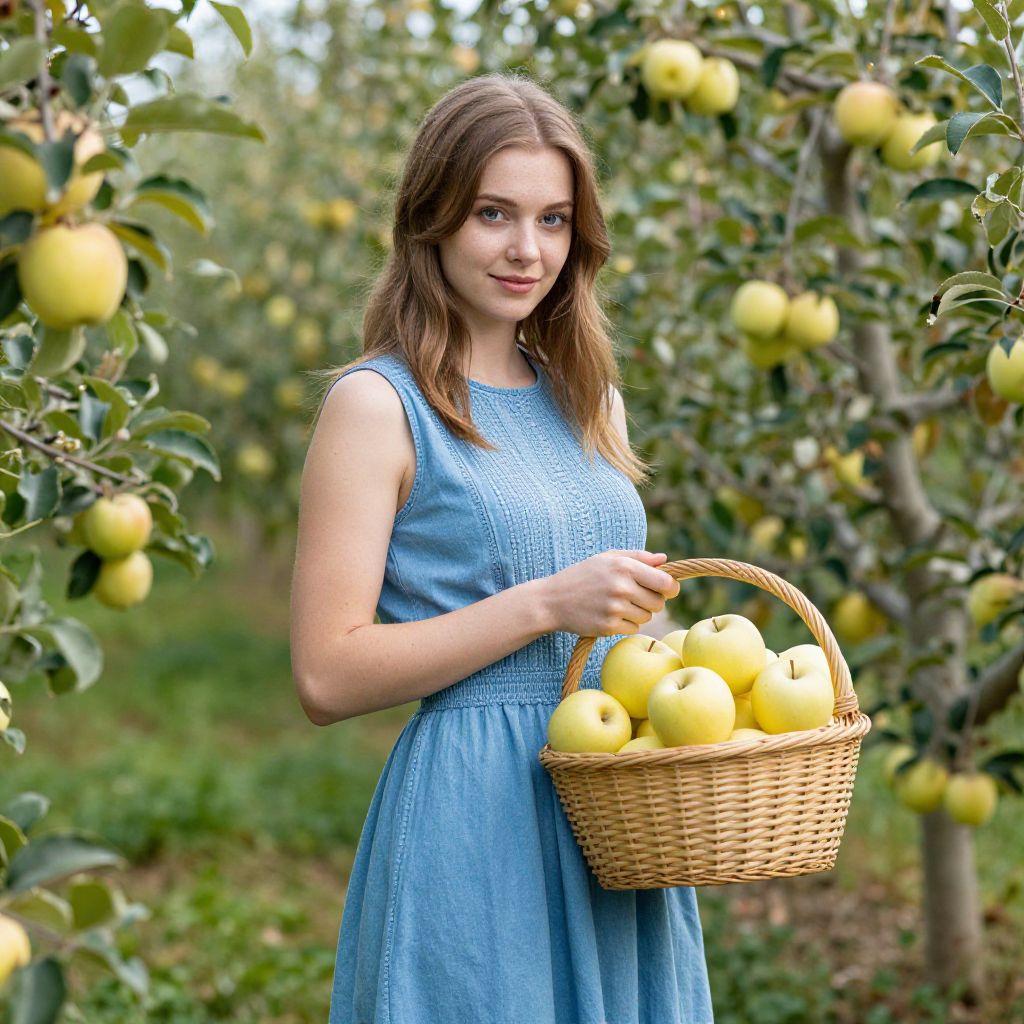 A young woman in a blue sleeveless dress stands in a lush green apple orchard, holding a basket filled with fresh yellow apples. The vibrant natural light highlights the serene atmosphere and the abundance of ripe fruit surrounding her.