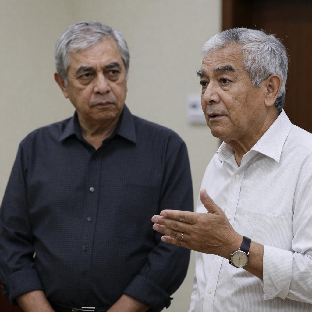 Old man with white hair, serious expression, black shirt, surrounded by a crowd raising their hands. Diverse crowd, blurred background, warm light, outdoor setting. Multiple people, varied skin tones, some visible hair colors: black, brown. Raised hands, excited expressions.
