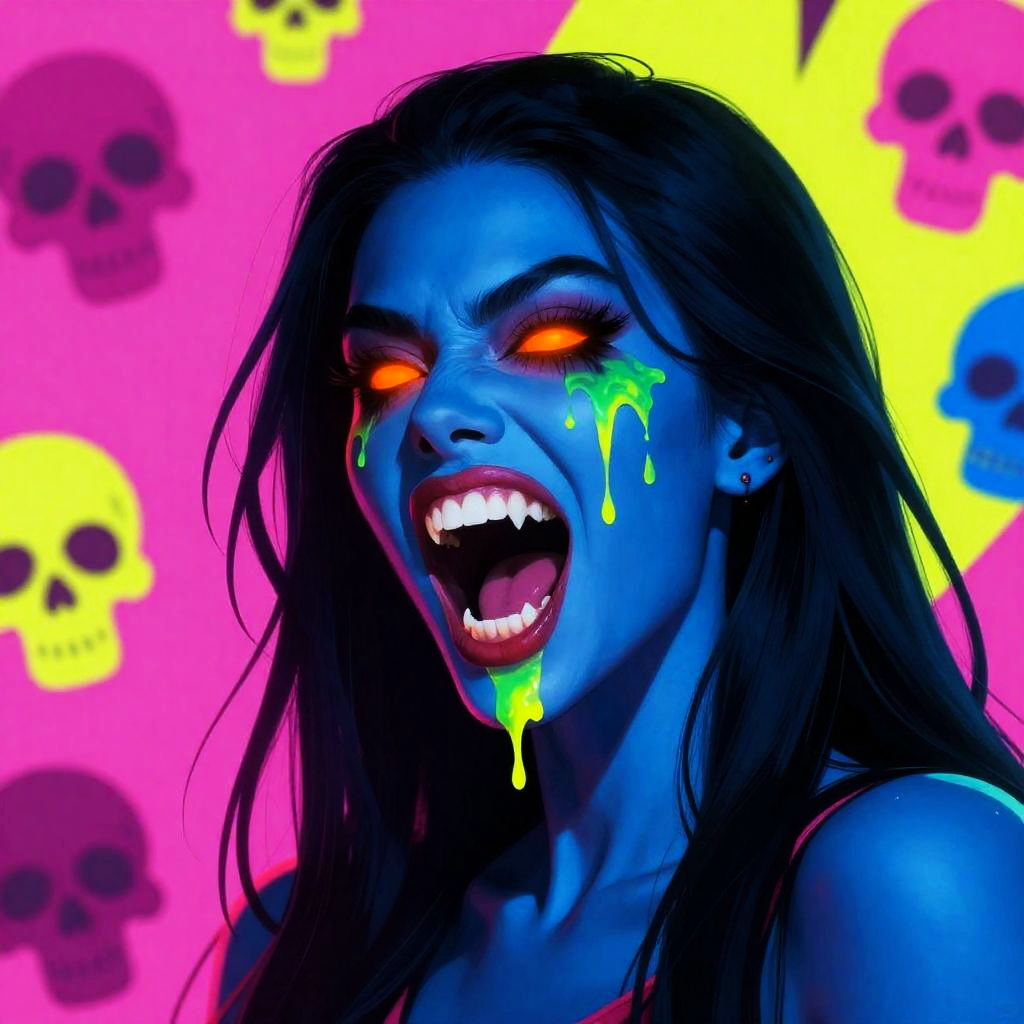 This is a vibrant, digital, pop-art style illustration of a menacing, blue-faced woman with long black hair. Her eyes are glowing orange, and her mouth is open wide, showing sharp teeth with green and yellow dripping from her face. The background is a neon mix of pink, yellow, and blue with skull motifs. The overall vibe is intense and eerie.