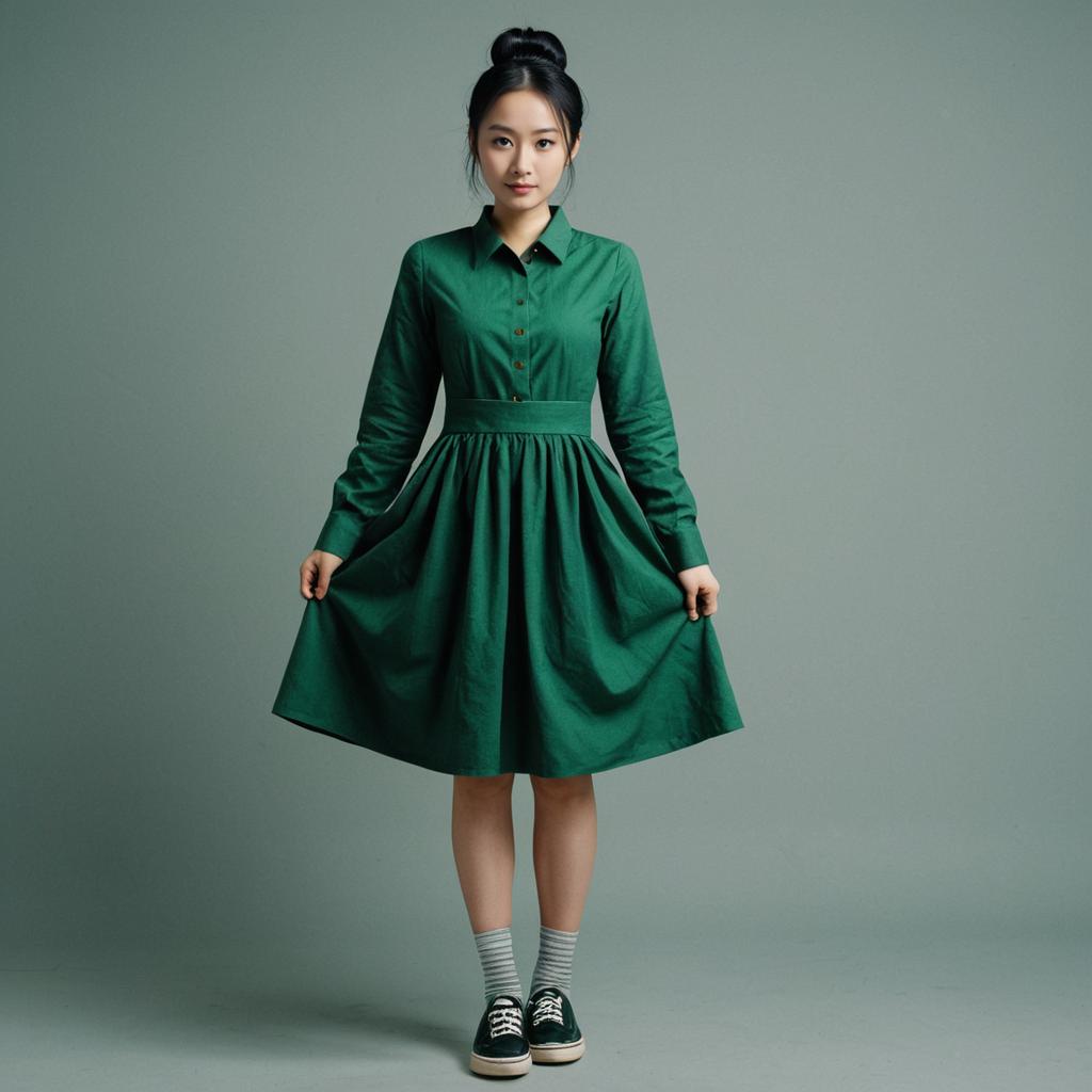 Portrait of an Asian woman standing against a grey background, wearing a long-sleeve green shirt dress with buttons and a fitted waist. She has black hair styled in a single bun and is wearing green sneakers with grey striped socks. The image shows a full body view with the woman holding the edges of her dress.