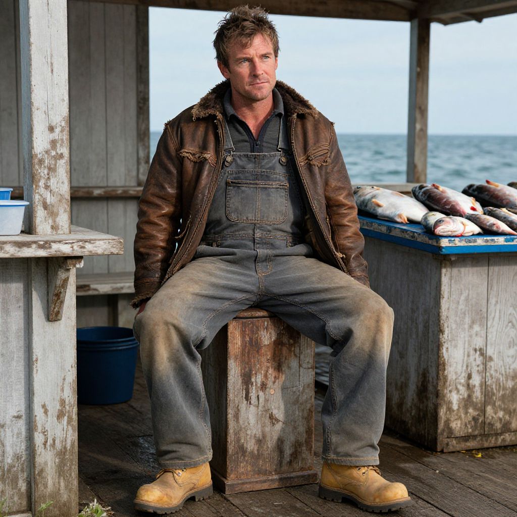 A man, western wear fringe jacket, distressed brown leather, matching brown leather pants, white cotton shirt, rugged tan cowboy boots, bustling fish market, Ilford film stock, confident expression, seagulls circling overhead. Man has masculine face and piercing eyes