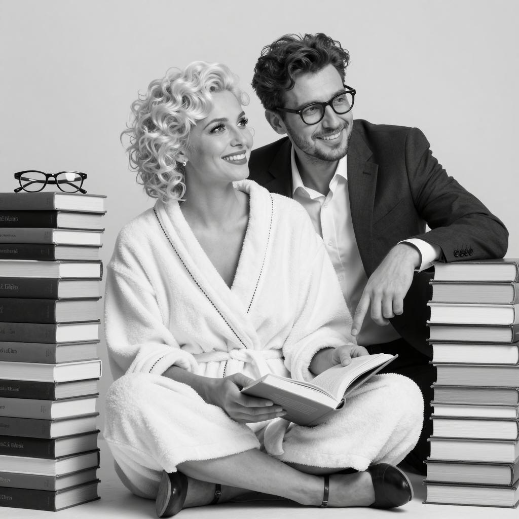 Black-and-white photograph of a man and woman sitting among stacks of books. Woman with platinum blonde curly hair, wearing a white robe with black trim, sits cross-legged, smiling. Man with dark hair, glasses, and suit, leans close, smiling at her. Books and glasses on the left. Woman holds an open book, man points at it. Both facing right.