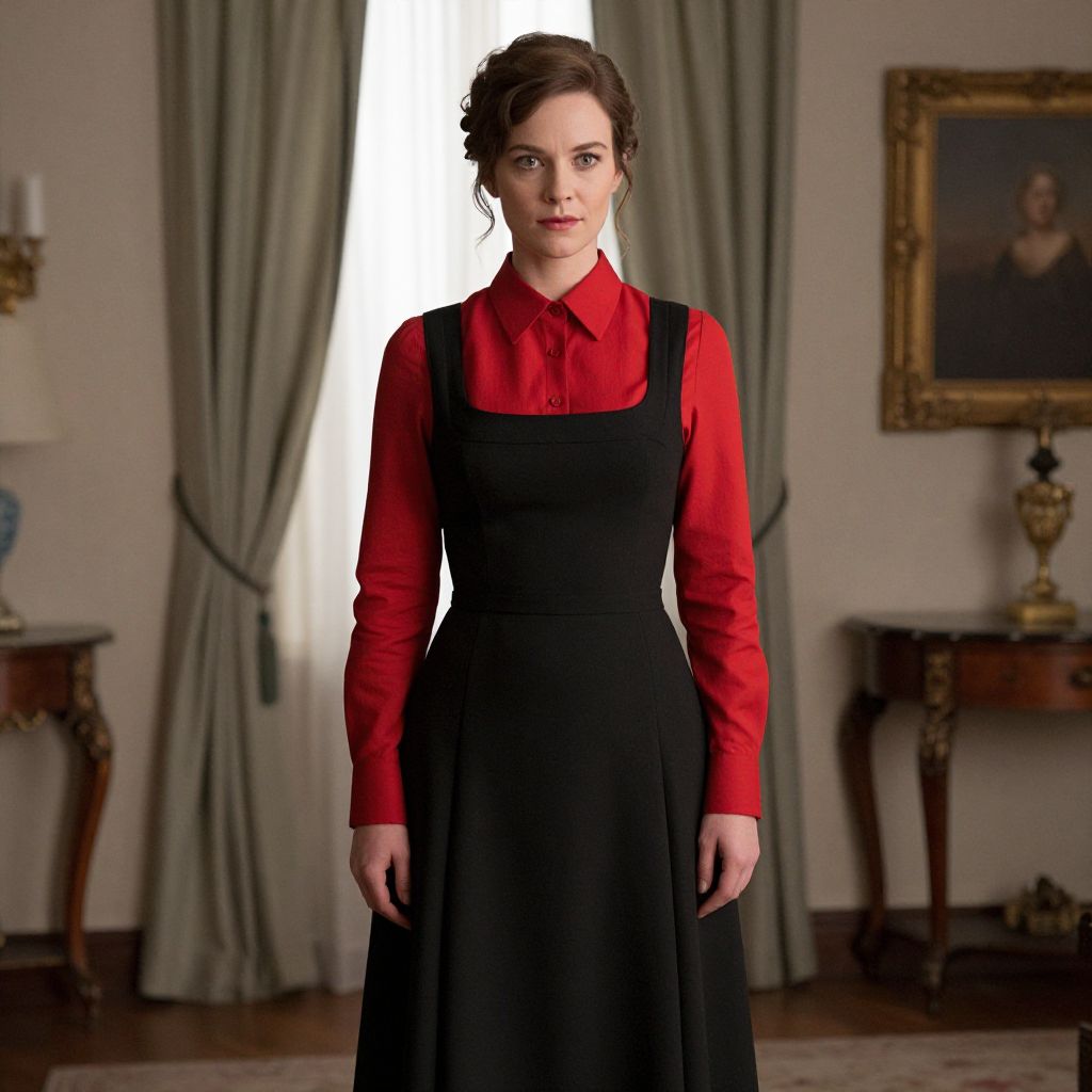 Photograph of a Caucasian woman with fair skin and dark brown, wavy hair styled in a low bun, standing in an elegant room. She wears a vibrant red long-sleeved shirt under a black, square-neck, knee-length dress. Her expression is serious, with slightly parted lips and direct gaze. The background features cream-colored walls, green curtains, a golden-framed painting, and a wooden table with a white-shaded lamp. The room has a classic, sophisticated ambiance with a polished wooden floor. The lighting is soft, highlighting her attire and the room's details.