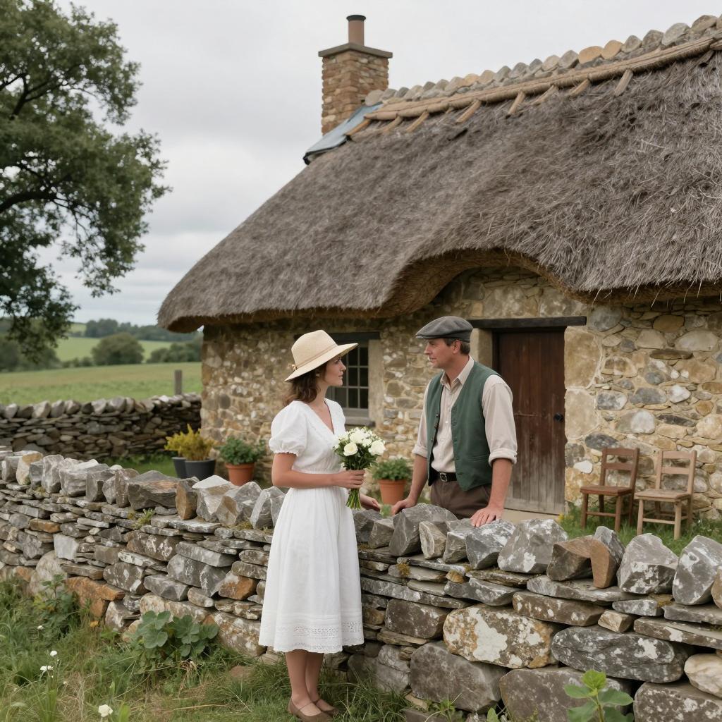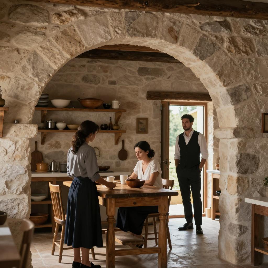 A rustic kitchen with a low stone archway. Two women with dark hair, one in a gray blouse and dark skirt, stands near a wooden table with bowls and cups. Another woman in a white top sits at the table. A man in a black vest, white shirt, and black pants stands in the doorway, partially illuminated. The walls are ured gray stone, with wooden shelves and pots.