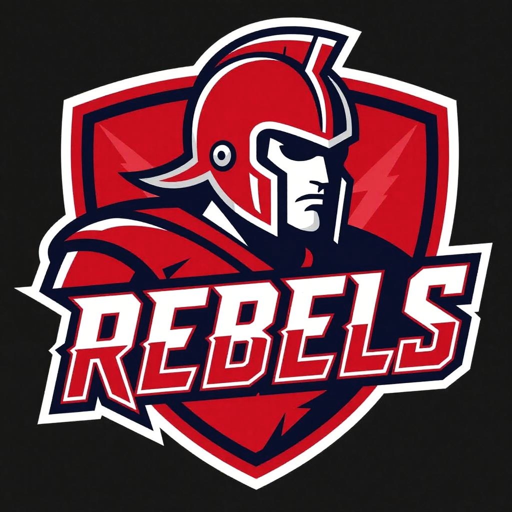 Rebels football logo in vintage style, featuring a fierce warrior helmet with bold red and black colors, dynamic typography in a rugged font, shield background with lightning accents, high detail, perfect for sports branding.
