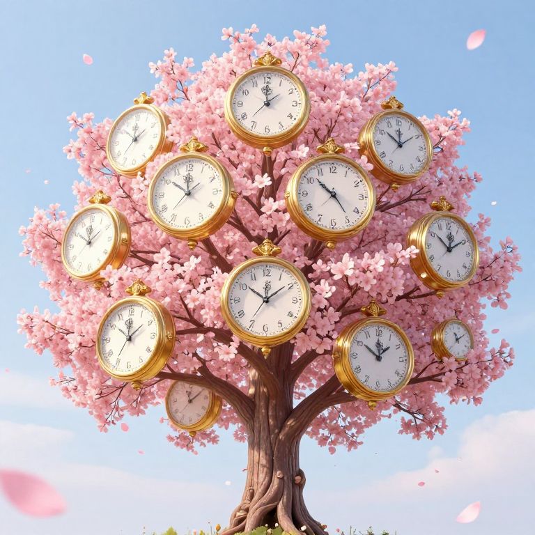 Digital illustration of a cherry blossom tree with 11 gold-rimmed clocks, each showing different times, against a clear blue sky.