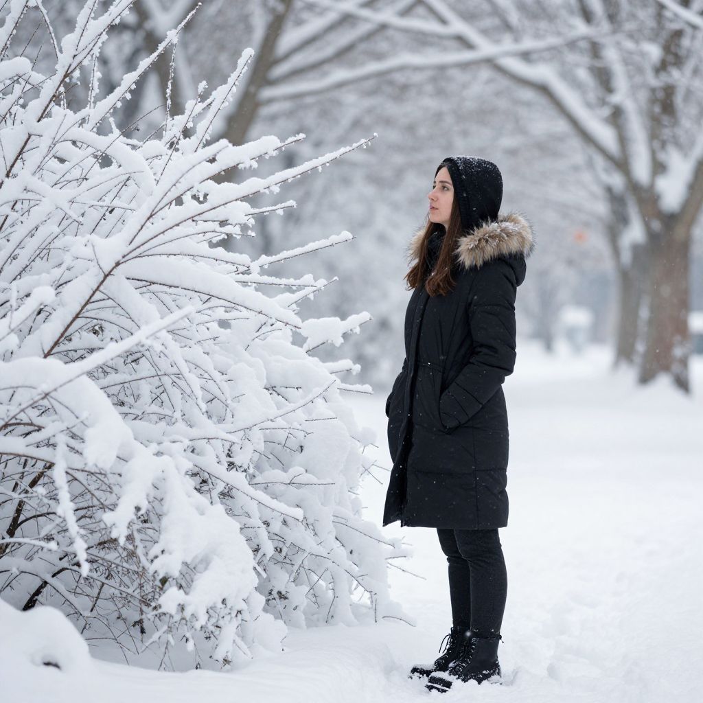 Woman by Snow-Covered Winter Plants