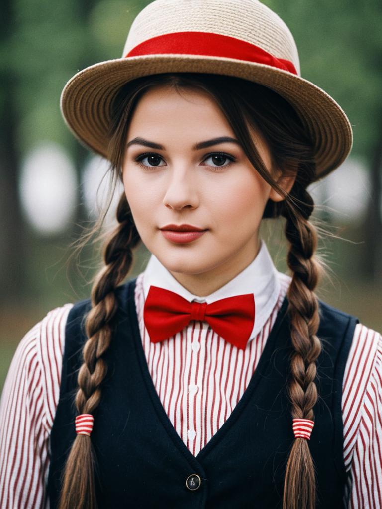 Mario kart girls costume, solo, 1girl, hat, overalls, brown hair, realistic, genderswap, genderswap (mtf), long hair, braid, shirt, looking at viewer, outdoors, smile, blurry, red headwear