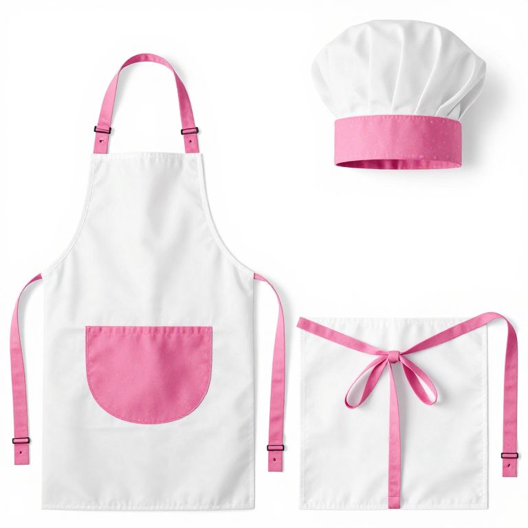 Photograph of a pink and white kitchen apron set against a white background. The set includes a white apron with a large pink pocket, pink adjustable straps, and a pink bow tie at the bottom. To the right, there's a white chef's hat with a pink band. The apron's fabric appears to be smooth and slightly shiny, while the pink accents are satin-like. The hat has a slightly ruffled texture. The items are neatly arranged, with the apron at the bottom left, the hat at the top right, and the bow tie directly below the hat.