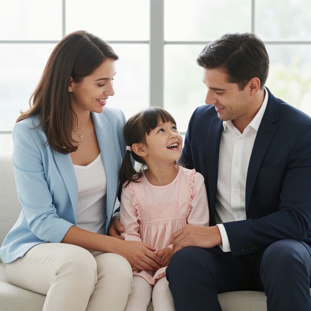 Photograph of a happy Caucasian family of three sitting on a white couch in a bright room with large windows. The mother, with shoulder-length brown hair, wears a light blue blazer and white top, and white pants. The father, with short dark hair, wears a dark blue suit with a white shirt. Their young daughter, with pigtails and wearing a pink dress with lace trim, smiles up at her parents. The parents are looking at each other and smiling, with the mother's hand on the daughter's lap and the father's hand resting on the daughter's hand. The background is bright and slightly blurred.