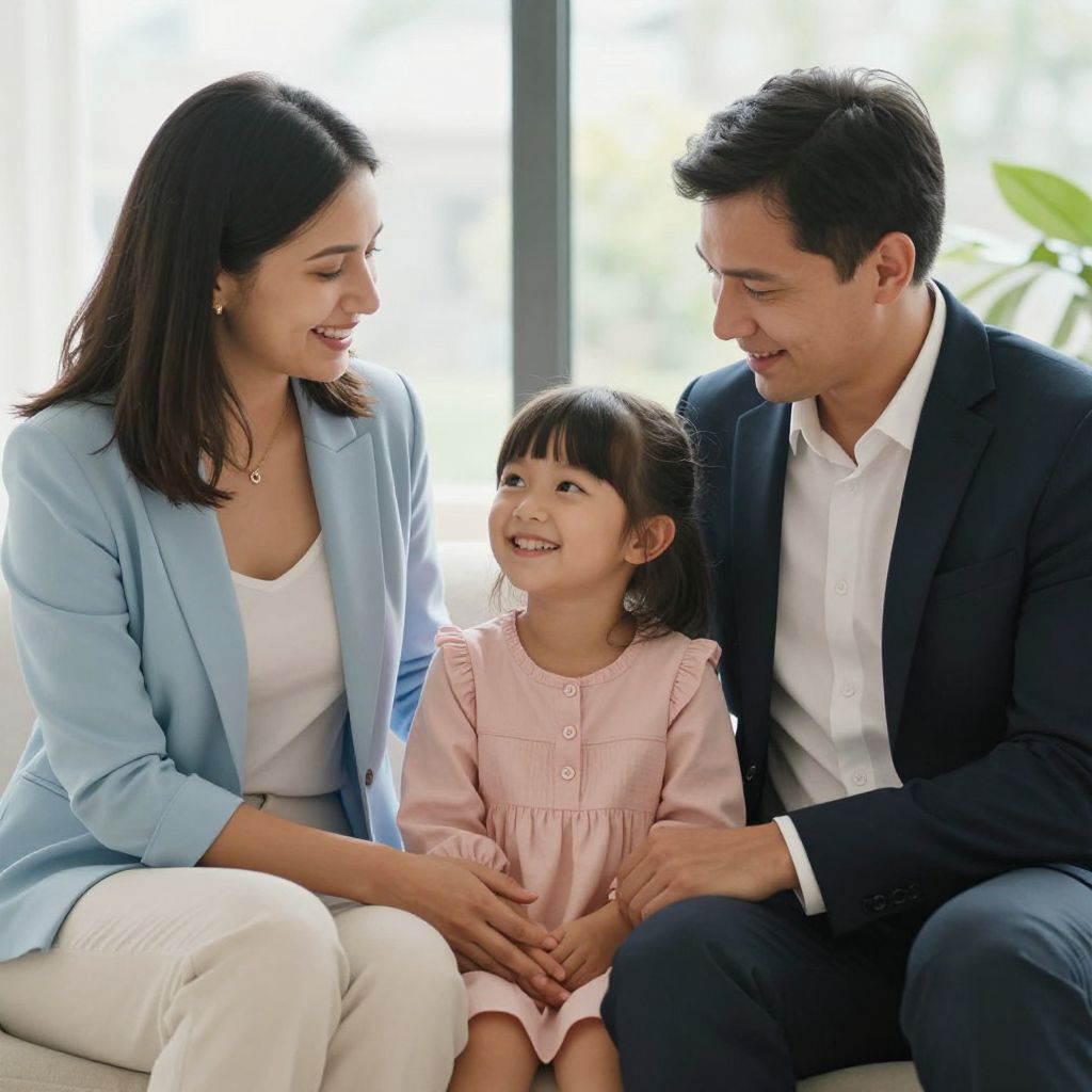Family members share a warm moment indoors, with a smiling woman in a light blue blazer seated to the left, a joyful child in a pink outfit sitting between them, and a man in a dark suit and white shirt to the right, all holding hands and looking at each other affectionately against a backdrop of natural light streaming through large windows.