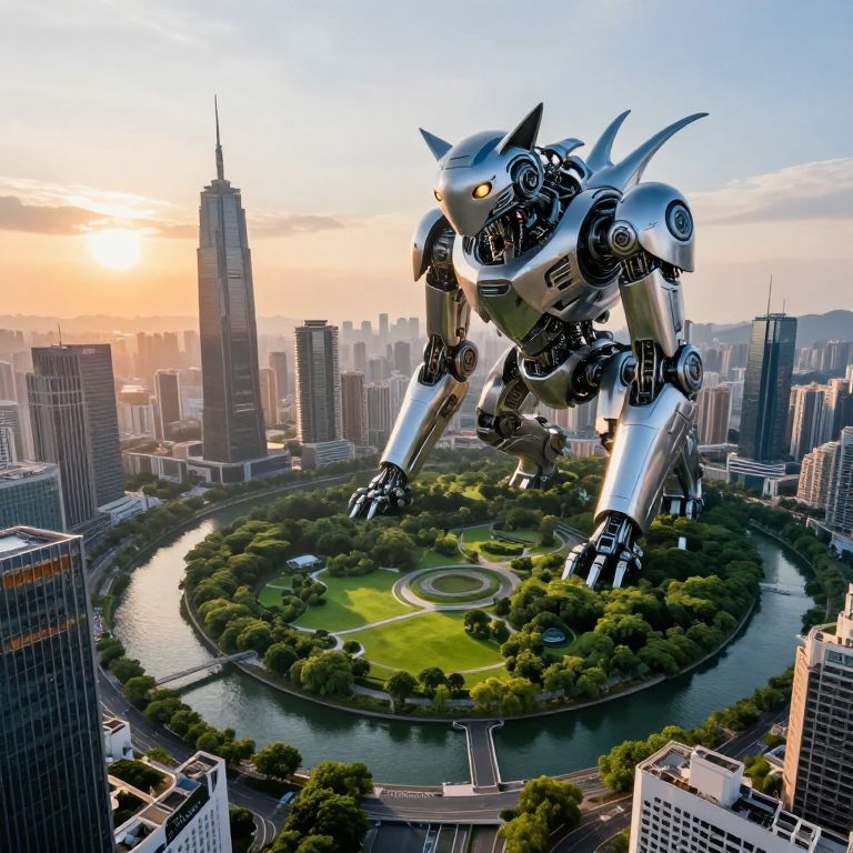 Photograph of a robotic, mechanical cat with metallic gears and wires, standing on a stone bridge at sunset, with birds flying overhead.