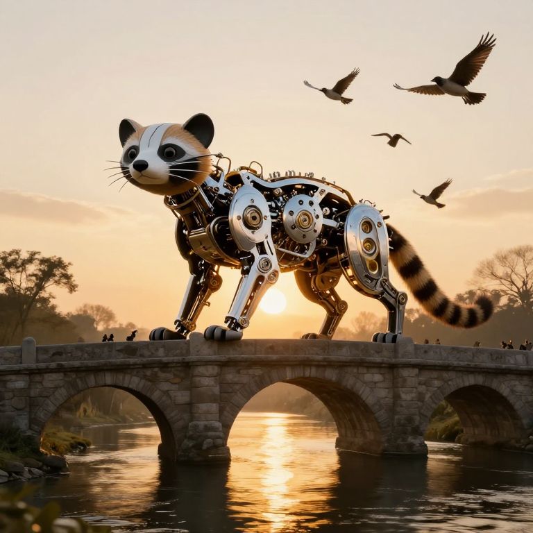 A digital artwork depicting a metallic, robotic cat with exposed gears and wires, standing on a stone bridge at sunset. The cat has a black and white color scheme with a striped tail, large black eyes, and whiskers. It is positioned mid-stride, with birds flying in the orange and yellow sky behind it. The bridge has three arches, and the water below reflects the sunset. Trees and foliage are visible on the left and right sides, adding to the serene yet futuristic atmosphere. The cat's mechanical design contrasts with the natural elements.